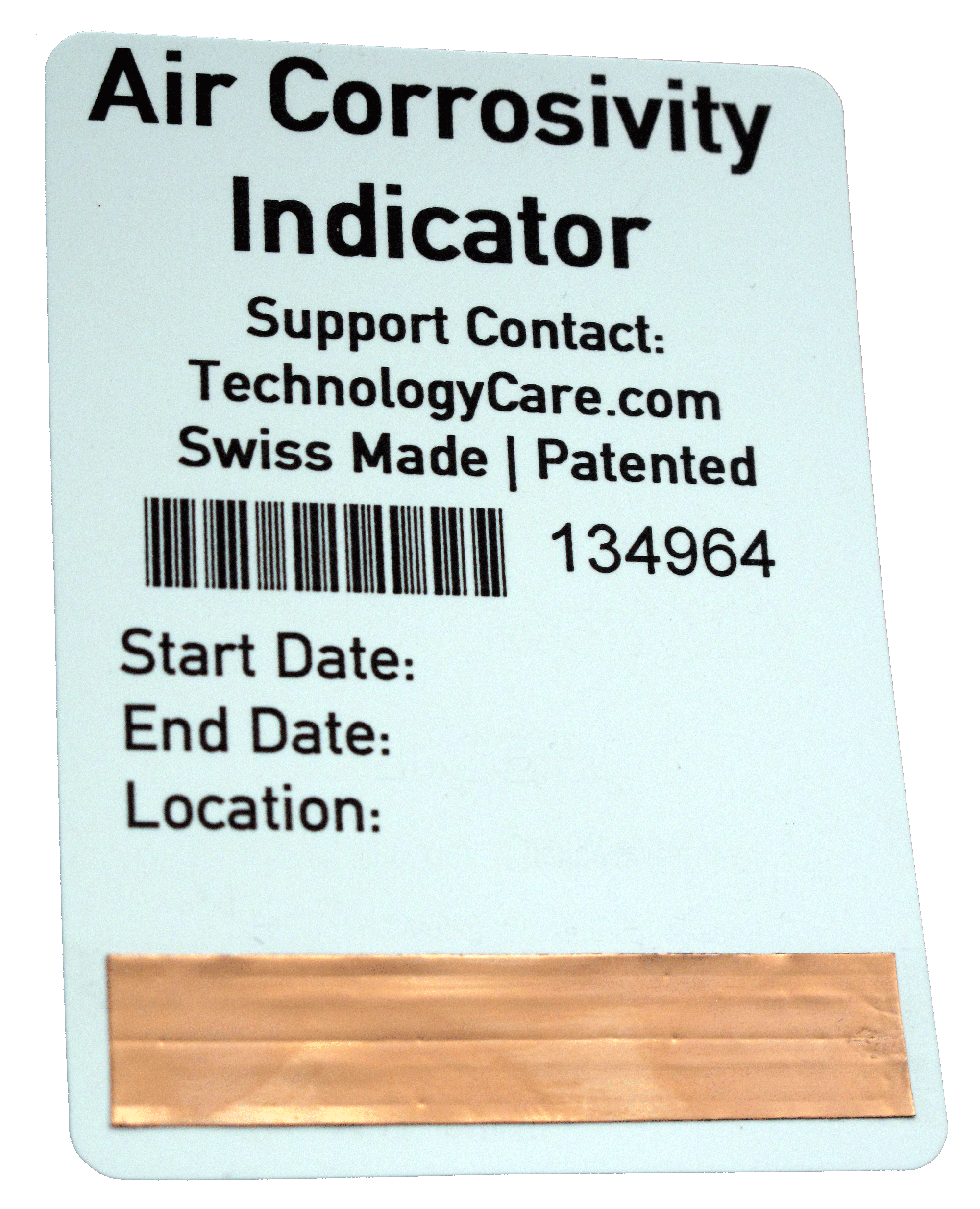 Copper reactivity strip darkens upon exposure to corrosive gases or particles, offering an instant visual alert. Kit contents: Indicator Card, adhesive tab, and prepaid international return mailer for optional lab report.